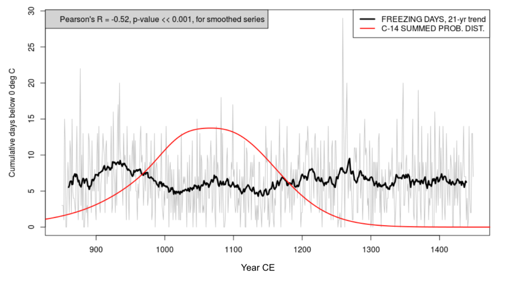 Something that never made it into the final version of the published paper, but was nevertheless interesting, is a model-based calculation of “freeze days”, sometimes termed dying degree days (DDD) analogous to growing degree days (GDD), used to measure growing season lengths. Maize rhizomes (roots) are vulnerable to damage when temperatures are below 4ºC for short periods, and leaf structures can be damaged below freezing (0ºC). The climate model calculates temperature at a test height of 2 meters above ground level, and we cannot say with confidence that the temperature at ground-level, or indeed some 10 cm into the soil, is this cold; however, we can say that the number of days for which low temperatures dominated during the year were least during the period of greatest occupation at several of the Fremont sites we studied (the figure below shows this for Range Creek Canyon, a tributary of the Green River in central-eastern Utah).