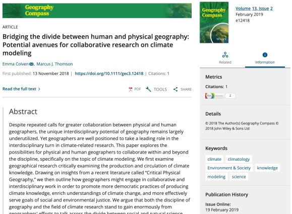 Abstract. Despite repeated calls for greater collaboration between physical and human geographers, the unique interdisciplinary potential of geography remains largely underutilized. Yet geographers are well positioned to take a leading role in the interdisciplinary turn in climate‐related research. This paper explores the possibilities for physical and human geographers to collaborate within and beyond the discipline, specifically on the topic of climate modeling. We first examine geographical research critically examining the production and circulation of climate knowledge. Drawing on insights from a recent literature called “Critical Physical Geography,” we then outline how geographers might engage in collaborative and interdisciplinary work in order to promote more democratic practices of producing climate knowledge, enrich understandings of climate change, and more effectively serve goals of social and environmental justice. We argue that both the discipline of geography and the field of climate research stand to gain enormously from geographers’ efforts to talk across the divide between social and natural science within and beyond the boundaries of geography.