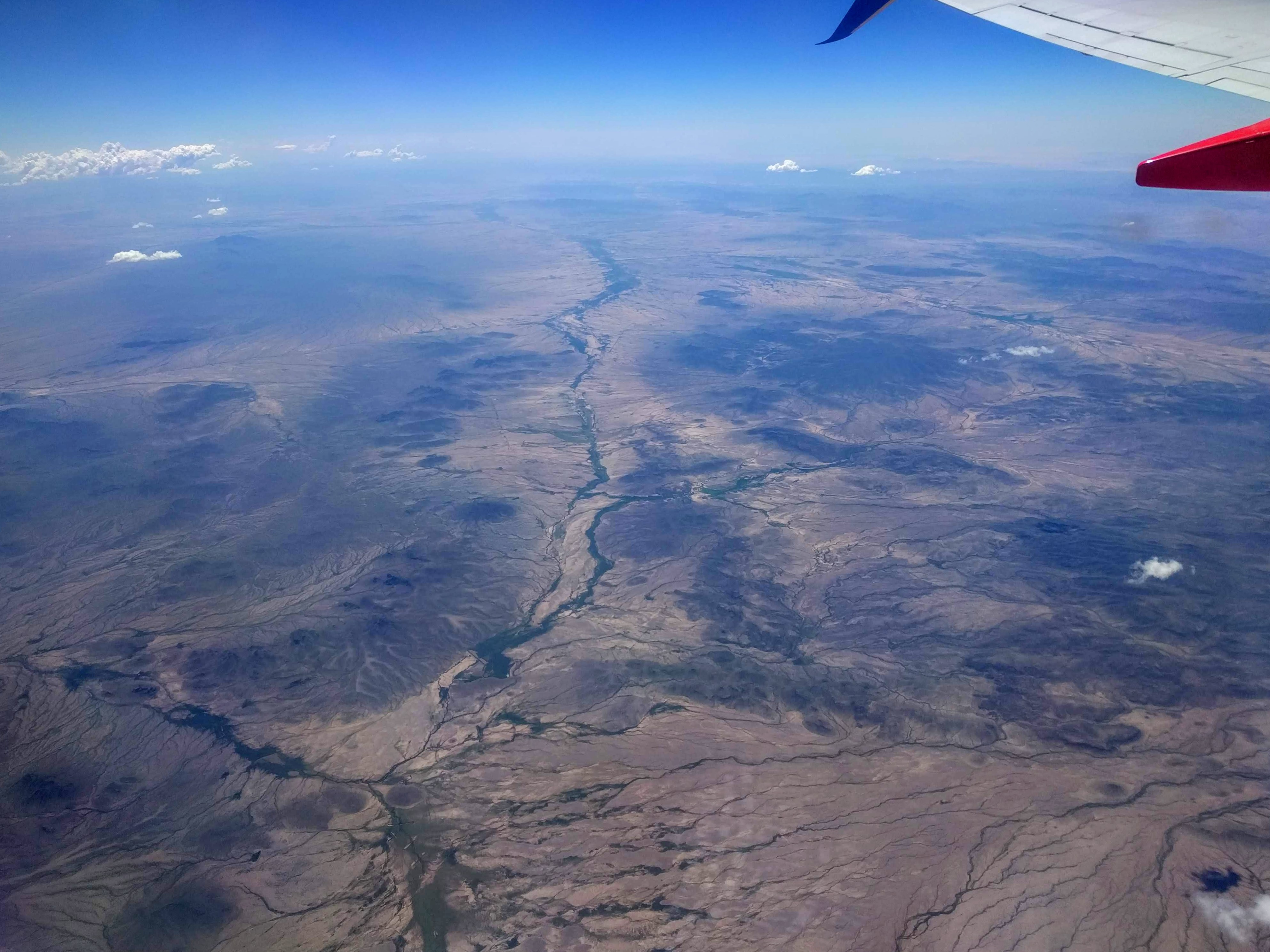 Probably the Gila River, Arizona. Colour and contrast modified to highlight the flora that has emerged following the rains, in the stream beds and on land which varies ever so slightly in elevation.